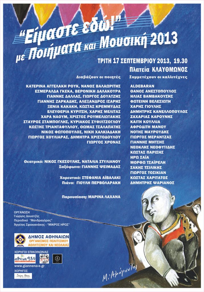Εκδήλωση ποίησης και μουσικής με τίτλο “Είμαστε εδώ, με ποιήματα και μουσική – 2013”. Πλατεία Κλαυθμώνος, Τρίτη 17...