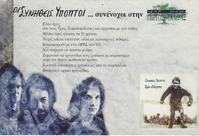 Τον Οκτώβριο 1996 κυκλοφορήσαμε στην Λύρα τις Μέρες Αδέσποτες με τους Συνήθεις Ύποπτους. Είχα ανασκουμπωθεί για να γίνουν γνωστά τα τραγούδια τους.